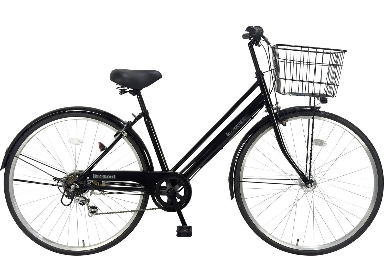 スチールフレーム 黒ハンドル 外装6段変速 LEDハブダイナモライト 1本スタンド ワイヤーカゴ バンドブレーキ |