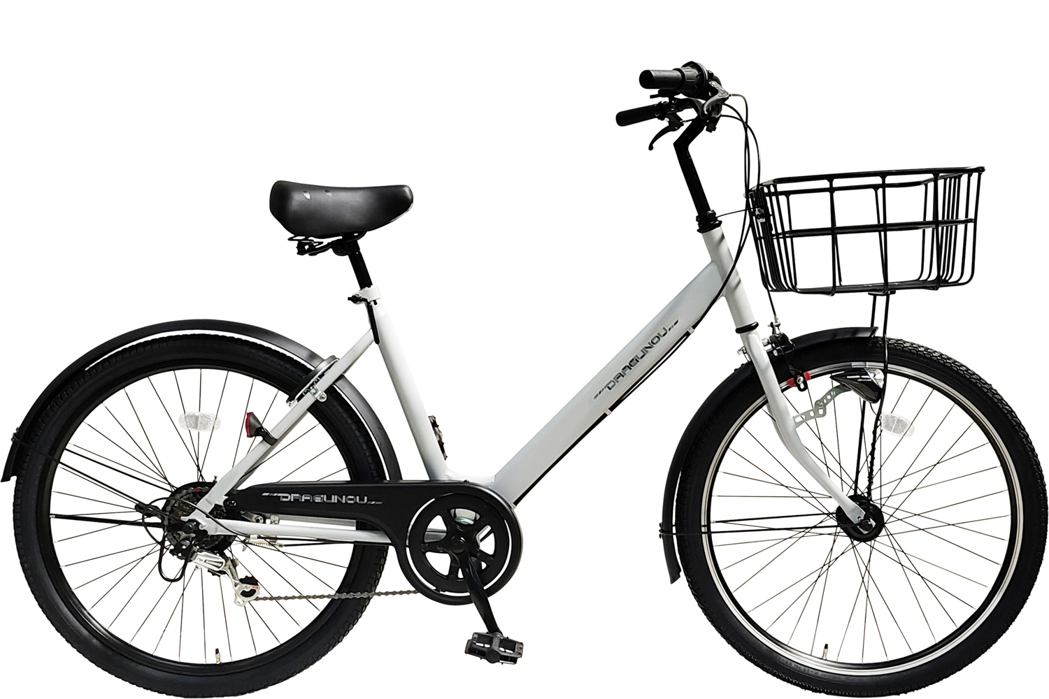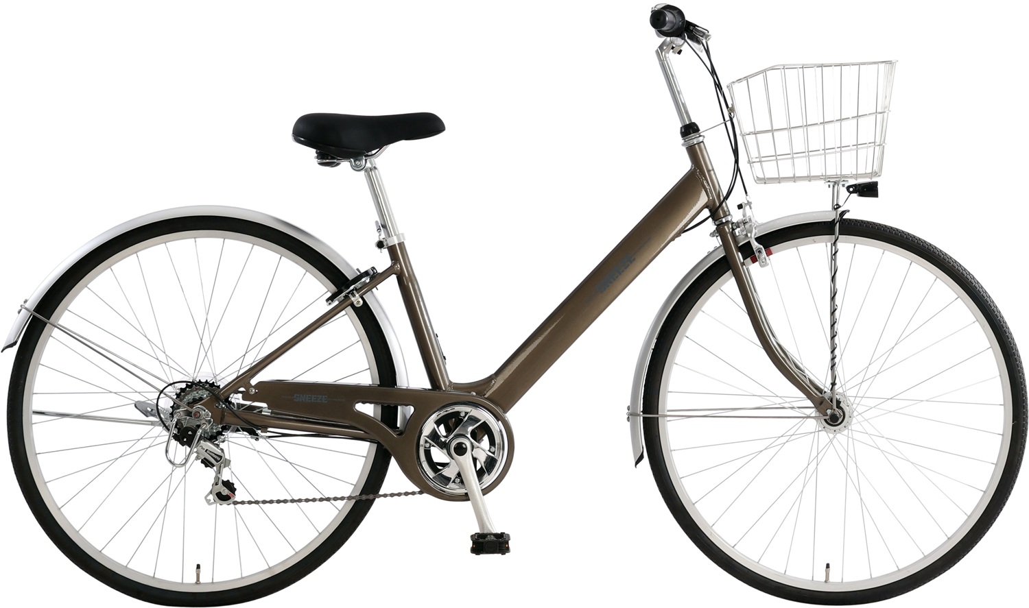 スチールフレーム ステンレスハンドル 外装6段変速 ハブダイナモ式 LEDオートライト 1本スタンド ワイヤーカゴ バンドブレーキ |