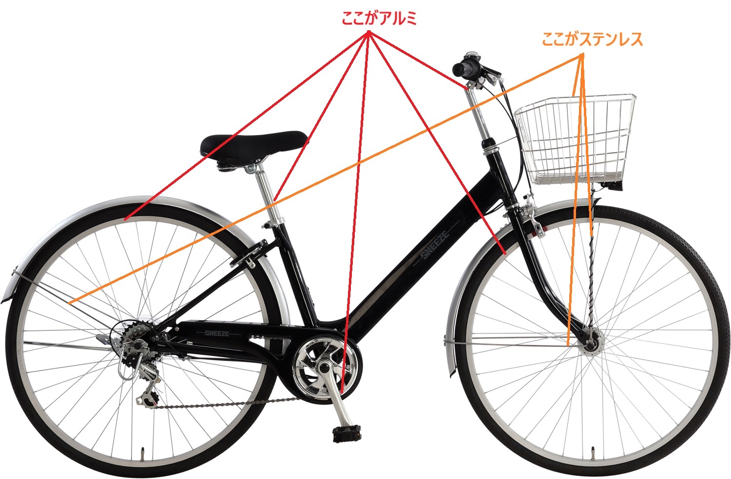 耐候性に優れたステンレスパーツ多用モデル ステンレスパーツ カゴステー ドロヨケ、ドロヨケステー ハンドル、ハンドルポスト フル装備 LEDハブ ダイナモライト 両立スタンド 外装6段変速 ローラーブレーキ BAA対応 |